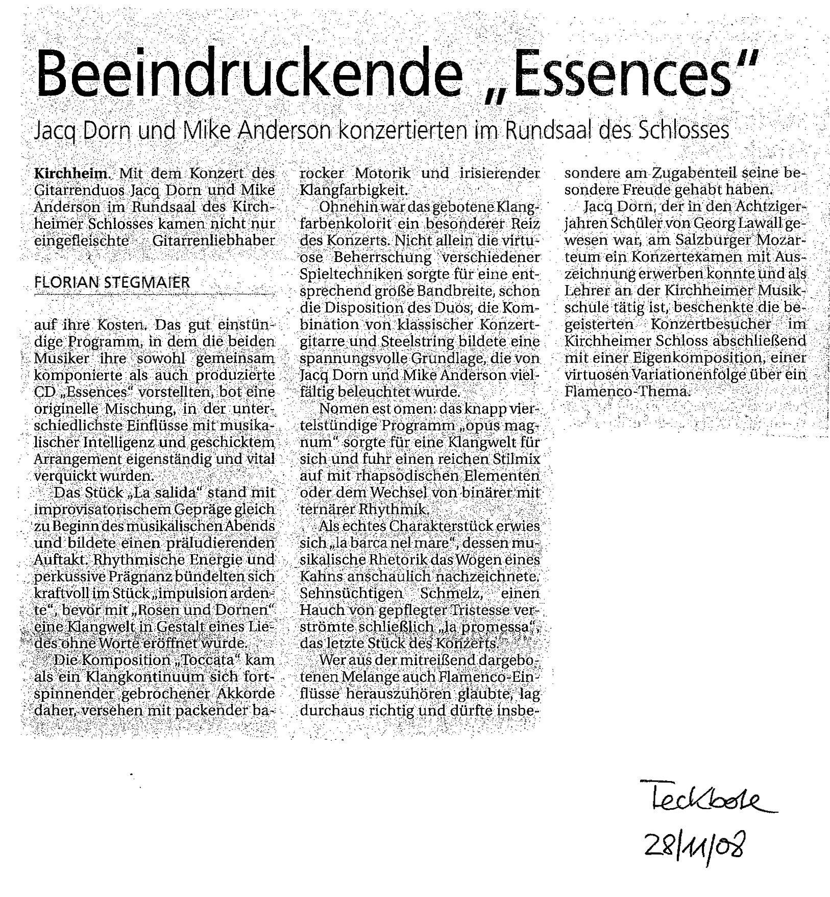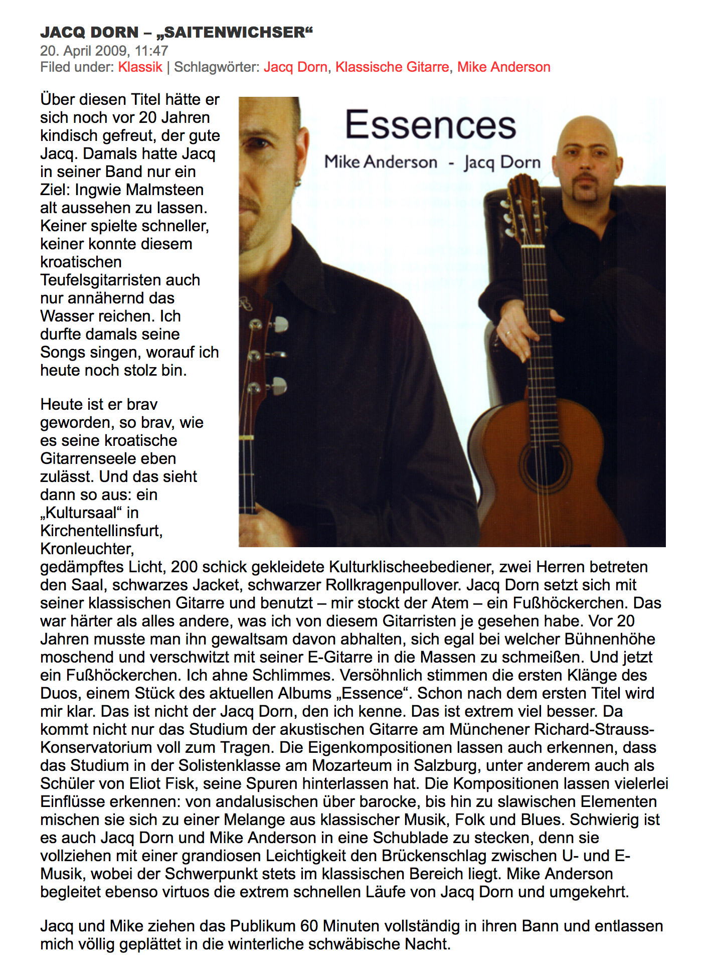 „Zur Second Summer Special Edition gab es zum Abendkonzert eine herausragende Leistung mit Gitarrist Jacq Dorn. Die Eigenkompositionen wurden stimmig perfekt und mit starker emotionalen Bindung und Wirkung dem Publikum vermittelt. Jacq Dorn profiliert sich durch die Kompositionen aus seiner Platte “ Crianza “ als versierter junger Komponist. Flamenco, Klassik mischen zu Elementen aus der Musik vom Balkan. Beeindruckende Technik, interessante und vielschichtige Kompositionen wovon noch Rede sein wird. Ein unvergesslicher Solo Recital voller Stimmung bei atemberaubende Virtuosität. Wir haben uns gefreut diesen Meister dem breiten Publikum vorzustellen dürfen.