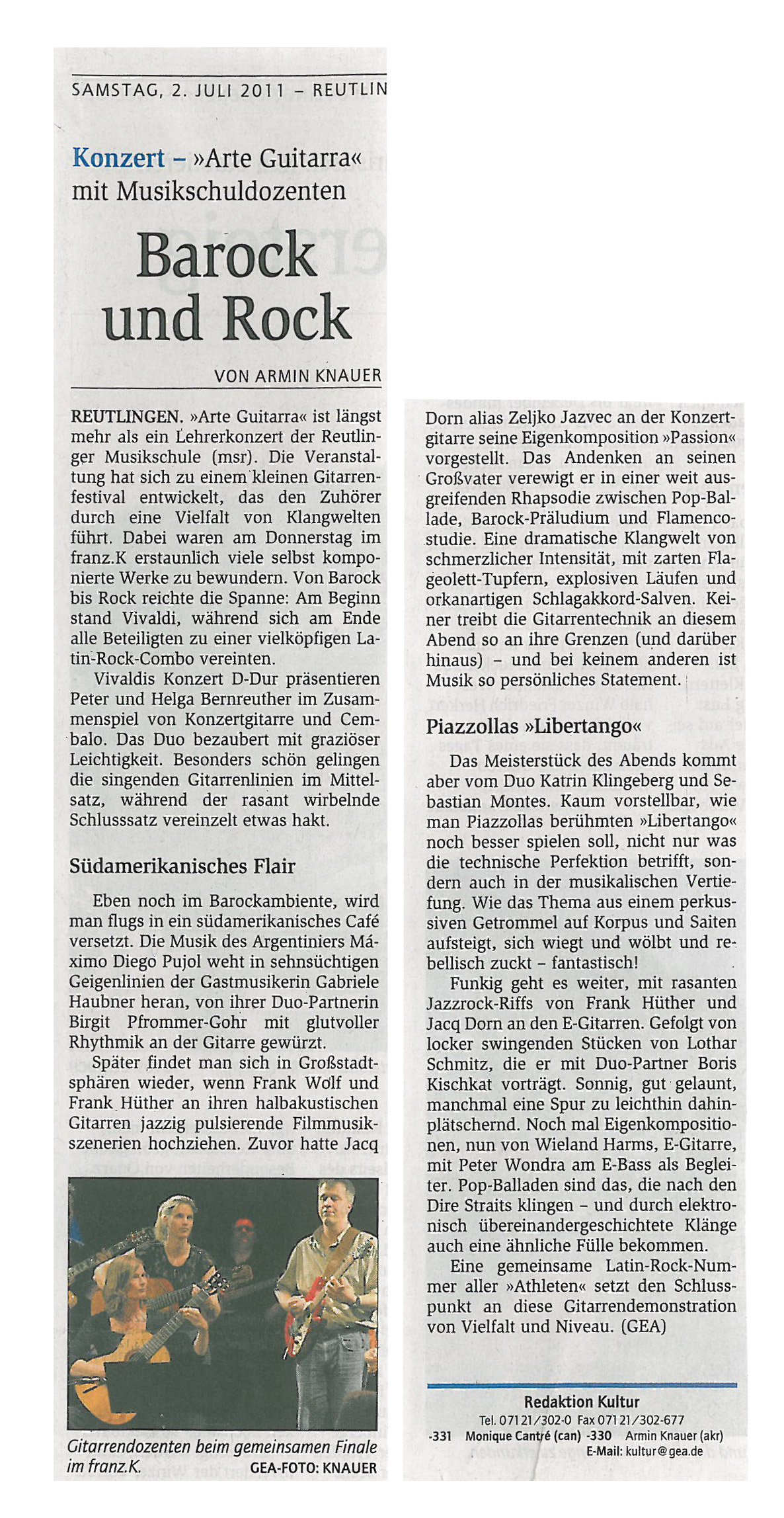 Jacq Dorn beweist an der klassischen Gitarre eine rasende Fingerfertigkeit, der einfach kein Tempo zu schnell, keine Zahl an Noten zu groß ist…»Ich bin kein Neutöner«, sagt Jacq Dorn, »Musik muss mein Herz ansprechen. Atonale Musik, die nur den Geist anspricht, erreicht mich nicht.« Mit diesem Kompositionsstil erreicht er an diesem Abend ganz offensichtlich das Reutlinger Publikum.